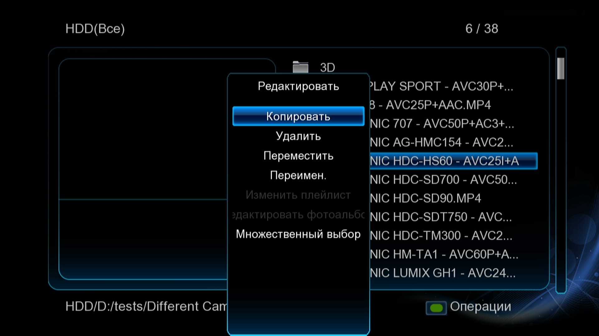 Ещё одна полезная кнопка пульта ДУ при работе с файловым браузером не имеет названия, зато отличается цветом — она зелёная (впрочем, подсказки в нижней части экрана всегда подсказывают пользователю, какие функции и на каких кнопках доступны в текущем окне). При её нажатии посреди экрана всплывёт ещё одно меню, в котором содержатся команды, отвечающие за работу с файлами: копирование, перемещение, удаление…