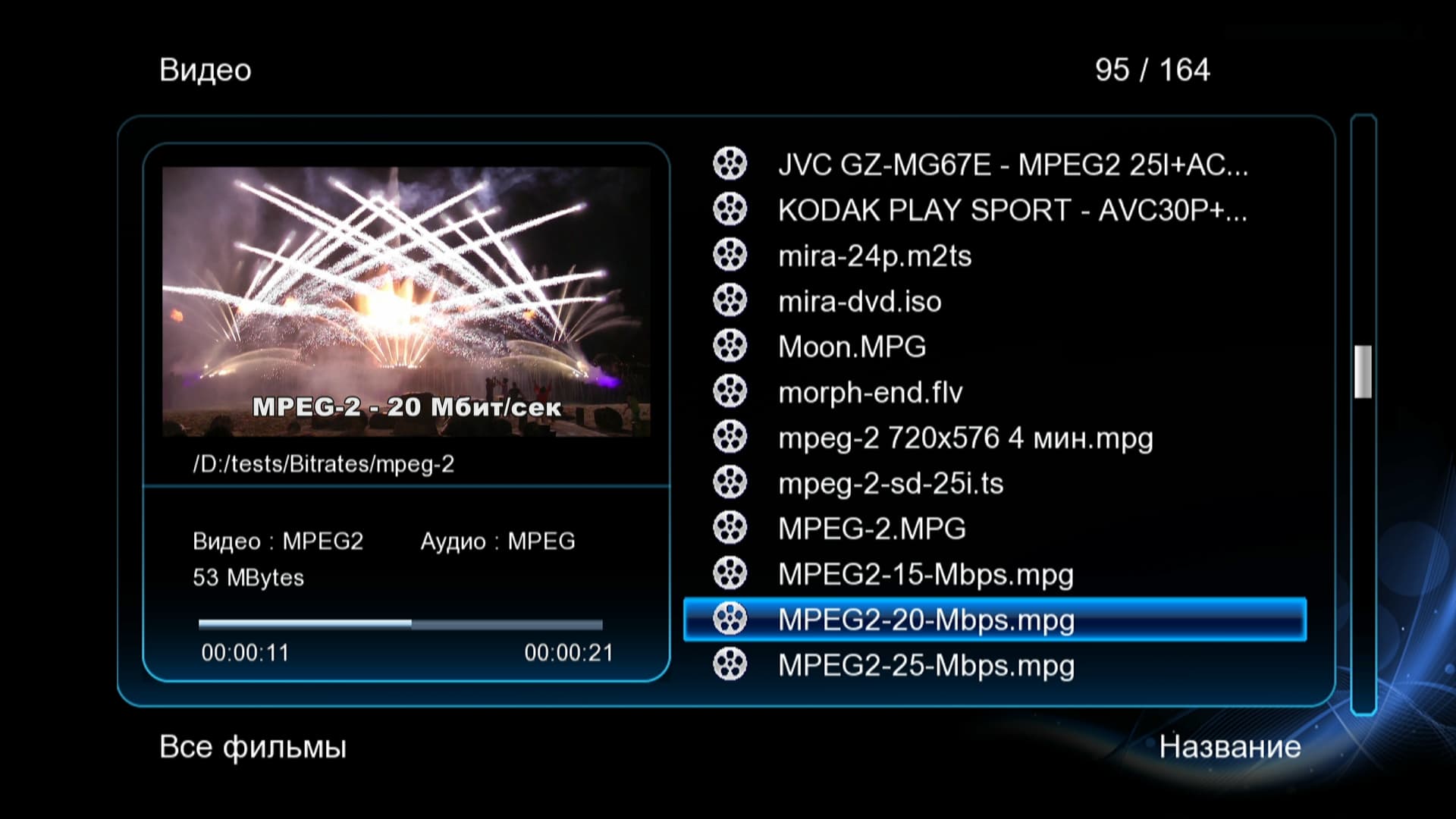 Здесь плеер сумел воспроизвести битрейты 10, 15 и 20 Мбит/сек, застопорившись на 25-мегабитном файле. Что для Wi-Fi вполне естественно, и более чем достаточно для просмотра не только видео с битрейтами DVD, но и так называемых HD-рипов (редкий «рип» дотягивает даже до 20 Мбит/сек).