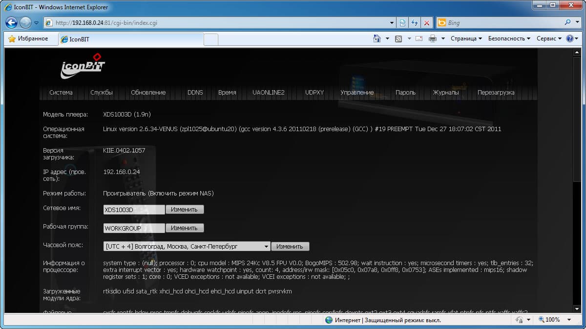 Думаете, это все возможности iconBIT XDS1003D? Ничего похожего! Расширенный вариант прошивки предоставляет ещё несколько функций, редко встречающихся и могущих оказаться полезными. Стоит лишь зайти на плеер, набрав в адресной строке браузера IP-адрес плеера:81, как пользователь увидит окно со множеством инструментов удалённого изменения настроек.