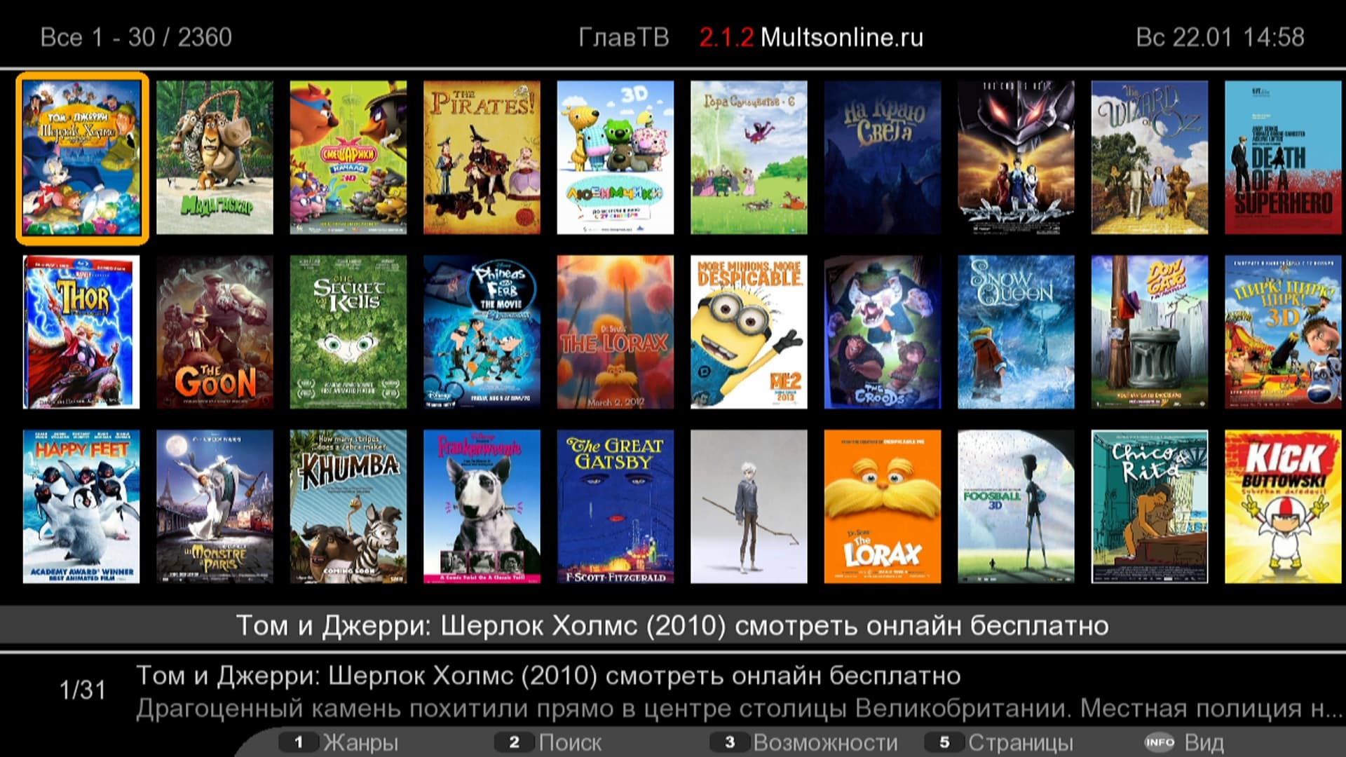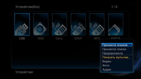 В нём представлены все доступные источники контента, подключённые в настоящий момент к плееру: флэшки, жёсткий диск, локальная сеть и т. д. Режим отображения этих источников, а также материалов, содержащихся на них, изменяется соответствующей командой во всплывающем меню. Вообще, следует почаще пользоваться кнопкой Menu на пульте ДУ — там можно найти много полезных операций: добавить файл или папку в Избранное или в Jukebox (сервис, хранящий и предоставляющий подробную информацию о фильмах), удалить штамп времени (запомненную позицию, на которой было прекращено воспроизведение файла), изменить правило сортировки файлов в менеджере.