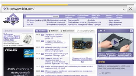 Последний перед настройками пункт главного меню — это Браузер. Нельзя назвать его очень уж быстрым, странички со сложным форматированием загружаются значительно медленнее, чем на стационарном ПК.