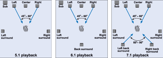 В отношении домашних кинотеатров, термины 5.1, 6.1 и 7.1 означают, что в воспроизводящей системе имеются 5, 6 или 7 основных спикера плюс сабвуфер. Сабвуфер воспроизводит LFE канал, записанный в 5.1 дорожке, плюс басы из основных каналов, если они не могут воспроизводить полную полосу частот. Разница между форматами заключается в количестве surround колонок: две в 5.1, три в 6.1 и, наконец, четыре в 7.1 системе.