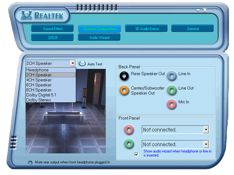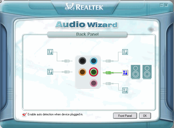 При подключении штекера в разъем по умолчанию автоматически появляется панель «Audio Wizard». Автоматическую детекцию можно отключить, а также самостоятельно вызвать соответствующей кнопкой в верхней части основного окна.
