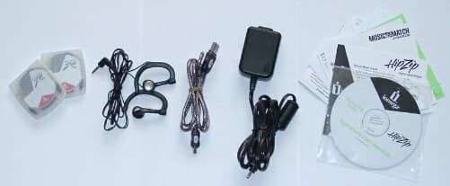 Итак, слева направо: два диска PocketZip, наушники Labtec LT-230, USB-кабель для подключения к компьютеру, блок питания (кстати, используется портативный, но довольно мощный импульсный БП 5,2v — 1,0A), набор брошюрок и два CD с программным обеспечением (на одном — MusicMatch Jukebox и Windows Media Player 7, а на другом — набор программ от Iomega).