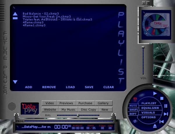 DataPlay FuturePlayer — одна из самых диких Jukebox-программ из всех, что мне приходилось видеть. Не считая корявость интерфейса, он совершенно неинтуитивен. Оказывается, основной плейлист совершенно не имеет никакого отношения к тому, что происходит на DataPlay-диске, за исключением загрузки его при старте программы. Далее вы можете использовать плейлист в своих целях — перекачка треков на диск реализована в совершенно отдельном окне. Процесс осваивания работы с этим монстром jukebox'остроения отнимет у вас не один час.