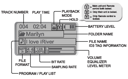 Поскольку экран пульта может отображать любую информацию, я рассмотрю ниже основную экспликацию экрана, которая используется при работе с плеером. Подобная экспликация является корпоративным стандартом для всех MP3-плееров от компании iRiver.