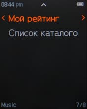 Музыка отображается в виде библиотеки, состоящей из пунктов «Воспроизводится», «Вся музыка», «Альбом», «Исполнитель», «Жанр», «Мои списки файлов», «Список закладок», «Мой рейтинг», «Список каталогов». Как видим, есть возможность просмотра папок и файлов прямо из режима воспроизведения музыки. Есть и обыкновенный браузер файлов, доступ к нему имеется из главного меню — там уже отображаются вообще все файлы, которые имеются в памяти, а не только поддерживаемые плеером.