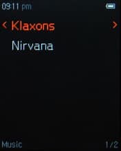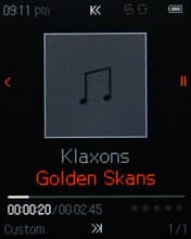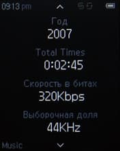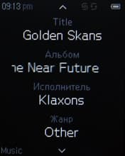 На экране во время воспроизведения отображается обложка альбома, если она вшита в тег. Если нет — изображена стандартная картинка. Далее все обычно: имя артиста, название песни (названия альбома, кстати, не видно на экране), режимы эквалайзера и воспроизведения, полоса прогресса, порядковый номер трека, текущее время, заряд аккумулятора, подсказки-пиктограммы.