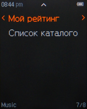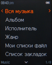 Музыка отображается в виде библиотеки, состоящей из пунктов «Воспроизводится», «Вся музыка», «Альбом», «Исполнитель», «Жанр», «Мои списки файлов», «Список закладок», «Мой рейтинг», «Список каталогов». Как видим, есть возможность просмотра папок и файлов прямо из режима воспроизведения музыки. Есть и обыкновенный браузер файлов, доступ к нему имеется из главного меню там уже отображаются вообще все файлы, которые имеются в памяти, а не только поддерживаемые плеером.