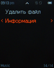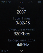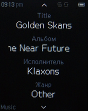 На экране во время воспроизведения отображается обложка альбома, если она вшита в тег. Если нет изображена стандартная картинка. Далее все обычно: имя артиста, название песни (названия альбома, кстати, не видно на экране), режимы эквалайзера и воспроизведения, полоса прогресса, порядковый номер трека, текущее время, заряд аккумулятора, подсказки-пиктограммы.