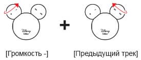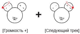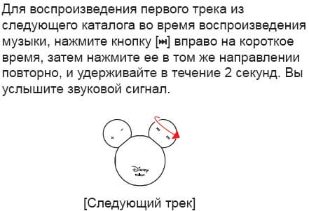 На «голове» у Микки (то есть на этом самом шарике) находятся: кнопка включения, информационный диод, а также отверстие со спрятанной в него кнопкой принудительной перезагрузки. «Уши» можно крутить в обе стороны. Одно «ухо» отвечает за регулировку громкости, другое — за переключение треков вперед/назад.