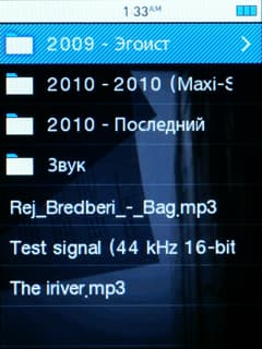 На официальном сайте компании в поддерживаемых форматах указаны только MP3, WMA, WAV, AAC, AC3. На деле к этому списку можно смело прибавить FLAC, APE, OGG и… WMA Lossless. При тестировании плееров без особой надежды я каждый раз пытаюсь открыть тестовый файл всеми моделями, и вот iriver S100 оказался первым плеером, не побрезговавшим этим форматом. Вот только плюс этот не очень «жирный» — формат не особенно популярен. То есть плеер получился крайне всеядным. APE проигрывается со степенью сжатия Fast, Normal и High. С тегами никаких проблем не возникло — и английские, и русские в разных кодировках нормально читаются. Обложка альбома тоже отображается, занимает большую часть дисплея и выглядит симпатично.