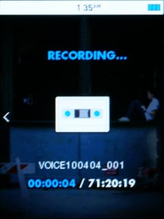 Диктофон записывает речь достаточно хорошо, пишет в формат MP3 с битрейтом 32, 64 или 128 Кбит/с. Качество записи у диктофонов в плеерах iriver всегда средне-хорошее, так и в этот раз. Вполне неплохое качество для записи речи, но не громких и басовитых звуков, от которых звук на записи «захлебывается».