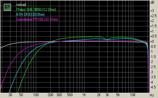 | Тест | noload | Philips SHE-9850 (12 Ohm) | ATH CK9 (30 Ohm) | Sennheiser PX100 (32 Ohm) |