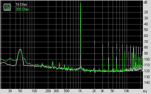 График гармонических искажений для сопротивлений 16 и 300 Ом:
