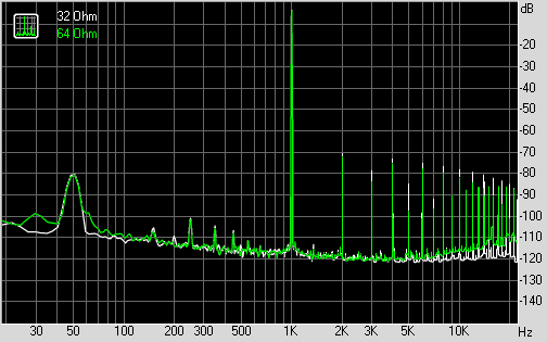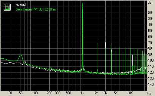 График искажений при подключении наушников Sennheiser (32 Ом) и график для режима без нагрузки: