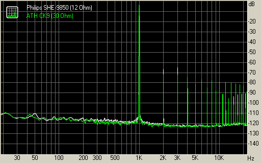 График искажений при подключении наушников ATH CK9 (30 Ом) и Philips 9850 (12 Ом):