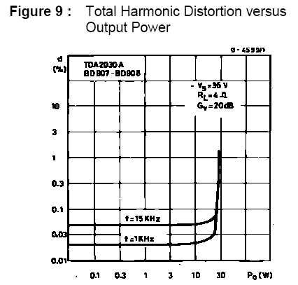 Из приведенных графиков следует, что TDA2030А развивает мощность до 18 Вт при весьма небольшом количестве искажений.