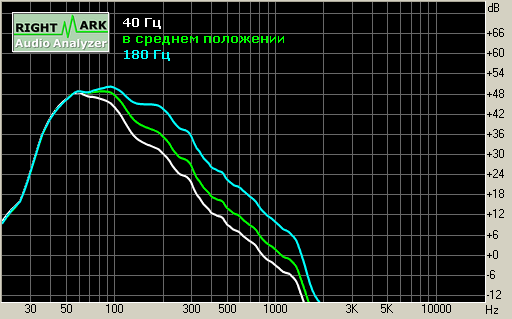 На измеренном графике АЧХ мы видим, что рабочий диапазон НЧ-динамика составляет 40 — 200 Гц, при положении регулятора частоты среза фильтра низких частот на 180 Гц. При других положениях регулятора, диапазон уменьшается, и верхняя граница составляет 100 Гц.