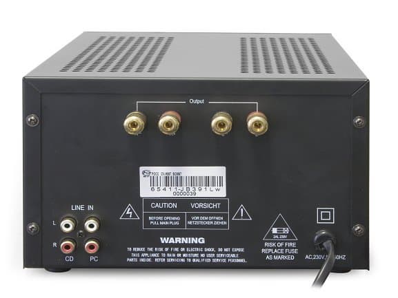Панель коммутации расположена на задней стороне блока и включает в себя линейные входы и винтовые зажимы для подключения колонок.