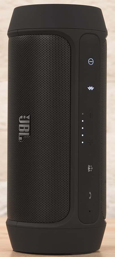 Для установки колонки в вертикальном положении на правом торце предусмотрены маленькие ножки (их видно на одном из фото). Индикатор под кнопками регулировки громкости демонстрирует уровень заряда батареи Charge 2.
