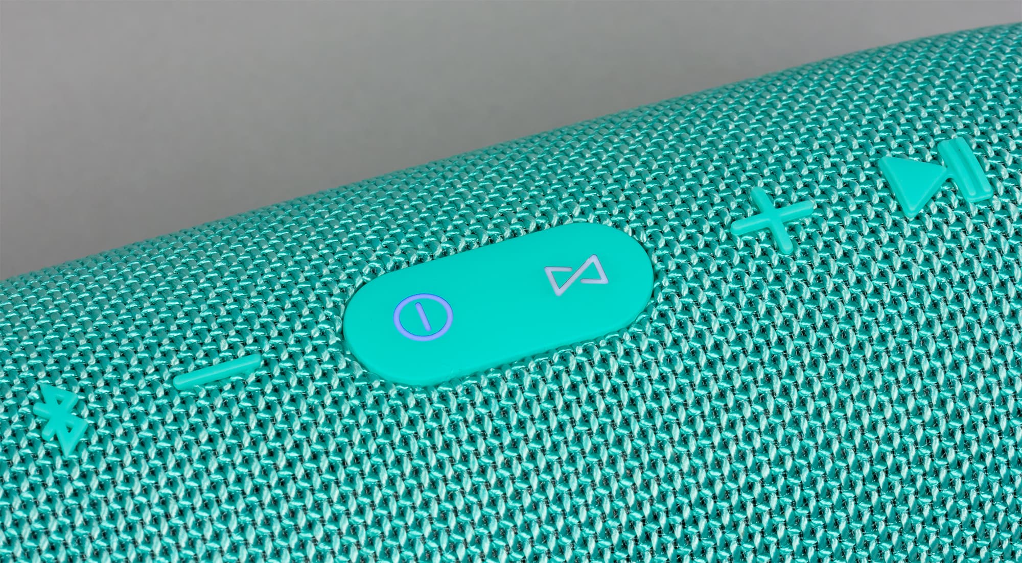 Помимо индикатора заряда, Charge 3 подсвечивает кнопку включения: синим при сопряжении по Bluetooth и просто белым во включенном состоянии. Кнопка JBL Connect рядом тоже горит белым при работе режима.