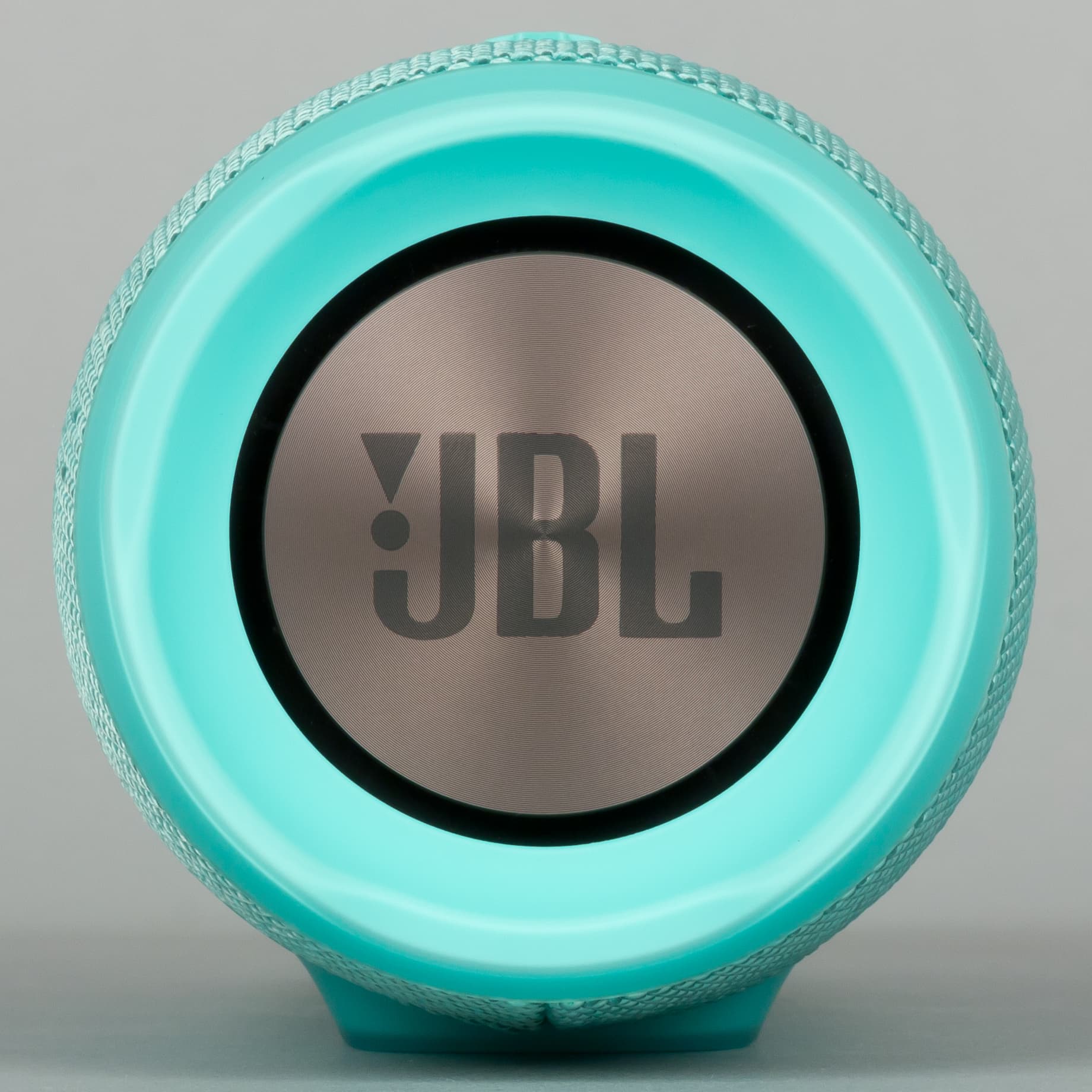 В центре корпуса колонки выделяется логотип JBL, внизу — пятипозиционный индикатор зарядки, яркий и весьма удобный. Даже если смотреть сверху, то можно понять уровень заряда по отражению от поверхности стола.