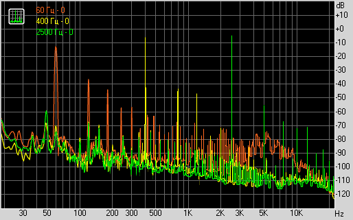 при подаче частот 60, 400 и 2500 Гц