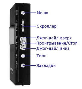Основные органы управления расположены на противоположной стороне. Орган управления, обозванный в руководстве «Джог-дайл» реально никакого отношения к Jog-Dial не имеет, хотя его использование чем-то и похоже на данный орган управления, но реализация другая: не качающаяся кнопка, а нормальная кнопка с расположенным под ней ползунком, фиксирующимся в крайнем положении. Впрочем, чтоб не создавать путаницы, мы будем называть в дальнейшем этот орган управления так же, как и создатели плеера. Он отвечает за перемотку, переключение треков вперед/назад, а его кнопочка работает как Play/Pause. К несчастью, последняя оказалась не слишком удобной, так что нажать ее можно лишь со второй-третьей попытки исключительно при помощи ногтя. Скроллер в KM-300 — самый важный элемент управления. Кроме, собственно, регулирования громкости (которая, к сожалению, сбрасывается при включении/выключении устройства), при одном нажатии на скроллер на экране появляется дополнительная информация о файле, при еще одном нажатии — лирика, при третьем — дата/время, четвертом — информация о памяти, прошивке и.т.п., а после пятого отключается дисплей. Долгое нажатие открывает список файлов и папок, для навигации по которым используется все тот же скроллер. Для перехода на уровень вверх используется кнопочка «Меню», которая при нормальных условиях включает/выключает режим радио, а при долгом нажатии — вызывает меню, для навигации по которому опять используется пресловутый скроллер :) Ниже расположены еще две кнопки «Темп» и «Закладки». Первая позволяет осуществлять повтор фрагмента, а при долгом нажатии включает режим регулирования скорости в диапазоне 75-140% исходной. Вторая при коротком нажатии устанавливает закладку, а при длинном переходит по ней, что может быть удобно при прослушивании аудиокниг или просто длинных композиций.