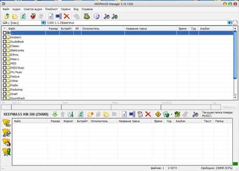 В отличие от других похожих программ, Keepmass manager показался мне не слишком удобным для копирования файлов в плеер, так как обычно сложно понять что, откуда и куда запишется после нажатия кнопки «Скопировать», да и навигация по файловой системе оставляет желать лучшего. Но это ей вполне можно простить за способность на лету перекодировать неподдерживаемые плеером звуковые форматы в MP3 или WMA (что является достаточно актуальным, если вспомнить об отсутствии поддержки в плеере OGG) и «грабить» CD с музыкой непосредственно в память плеера,. Кроме этого, программа также позволяет редактировать тэги и названия файлов, по функциональности приближаясь к специализированным утилитам для массовой работы с ID3. Из явных недостатков — нет редактора лирики; сомневаюсь, конечно, что функция ее просмотра в плеере будет пользоваться особой популярностью, но из принципа нельзя не отметить.
