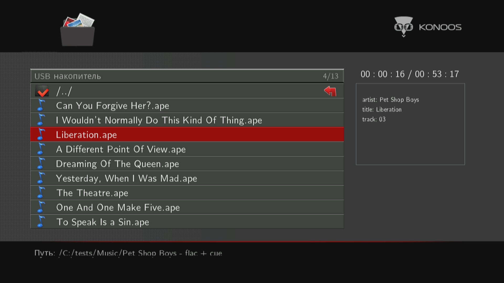 При воспроизведении музыки на экране отображается список файлов в плей-листе, имя текущей композиции и время её проигрывания. Как и было указано в таблице спецификаций, плеер умеет проигрывать lossless-аудио; список воспроизведения в формате *.CUE корректно поддерживается.