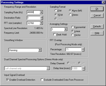 Real Time — измерения в реальном времени, Recorder — запись и обработка файлов, Post Process — постообработка, в которой имеется возможность использования перекрытий (FFT overlap) для более точного измерения.