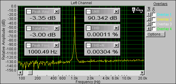 Для количественной оценки технических параметров качества звучания используется программа SpectraLab 4.32.14 (www.soundtechnology.com). Спектрограммы тестов на нелинейные искажения и шумы получаются при подаче на вход эталонного синусоидального сигнала частотой 1 кГц. Тестовый синусоидальный сигнал с амплитудой -3 дБ был получен в wav-редакторе CoolEdit 2000 генератором синусоидального сигнала Generate/Tones.