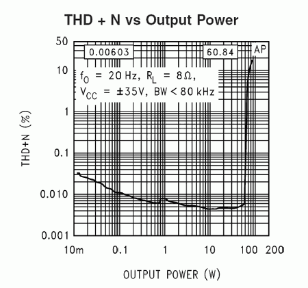 На приведенном графике зависимости THD от мощности можно видеть очень высокие значения мощности при низком уровне искажений, порядка 60 Вт при уровне искажений, составляющем менее 0,1%.