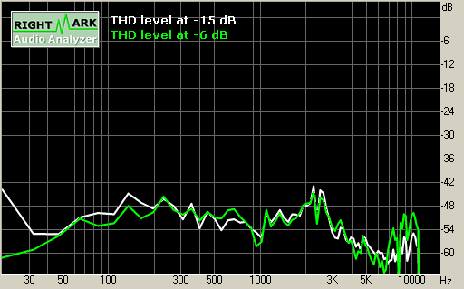 На измеренных спектрограммах искажений можно видеть достаточно низкий уровень искажений не превышающий -42 дБ (1%) в рабочем диапазоне.