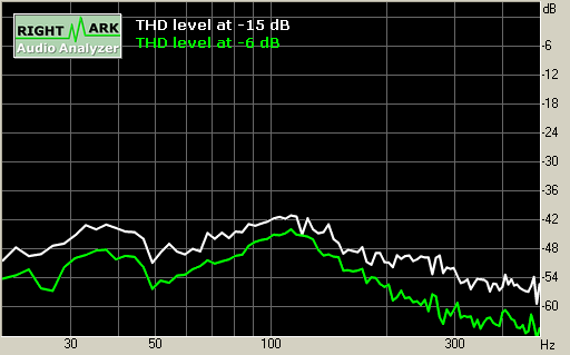 У сабвуфера, также как и у сателлитов, мы можем видеть низкий уровень искажений, составляющий в рабочем диапазоне не более -42 дБ. Для сабвуфера такие результаты похвальны.