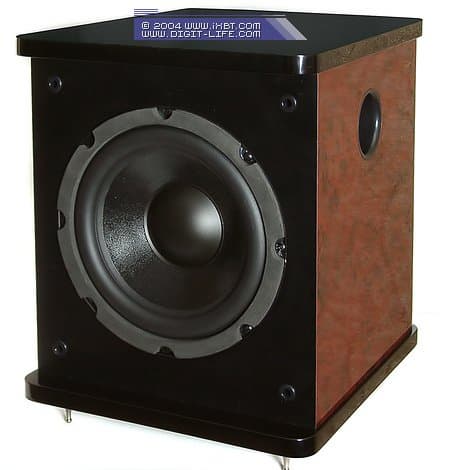 Габариты сабвуфера составляют 27 х 34 х 34 сантиметров. При этом сабвуфер устанавливается на специальные металлические ножки-шипы.