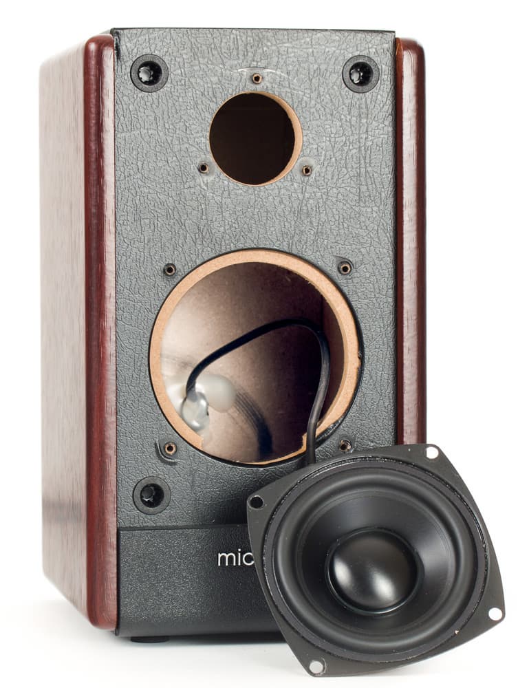Изнутри конструкция выглядит не очень симпатично: голые панели, стыки которых кое-где укреплены кривовато приклеенными брусочками из того же МДФ. Никаких распорок для повышения жесткости, никакой отделки звукопоглощающим материалом… К тому же, чтобы динамик (а он вставляется снаружи) не выступал из плоскости лицевой панели, по его контуру сделано фрезерованное углубление. Эстетически это оправдано, но жесткость самой панели снижена. Сам динамик крепится непосредственно к панели, без всяких прокладок.