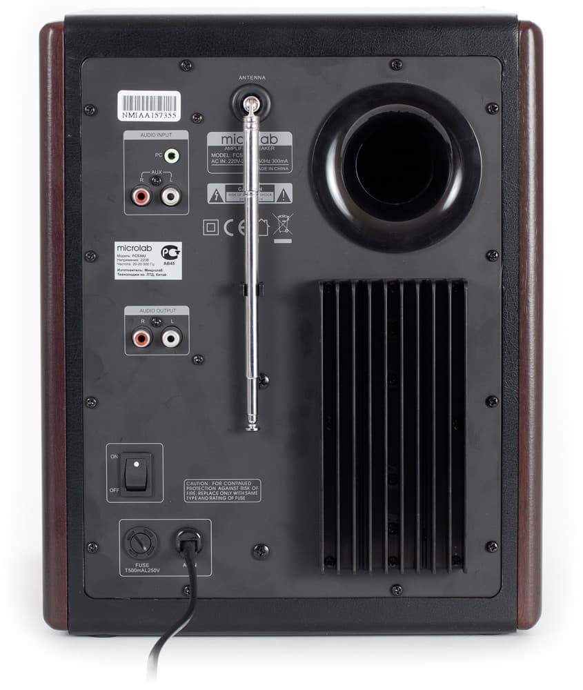 Корпус (В×Ш×Г: 301×242×280 мм) сделан из МДФ с облицовкой темно-коричневого цвета. Верхняя крышка отделана приятным на ощупь черным материалом под кожу. Таким же материалом покрыта и часть передней панели, скрывающаяся за съемной декоративной сеткой. Подобное оформление уже использовалось фирмой — например, модель Microlab FC330 2008 является прямо-таки «близнецом» FC530U (собственно, этого можно было ожидать, исходя из названия).