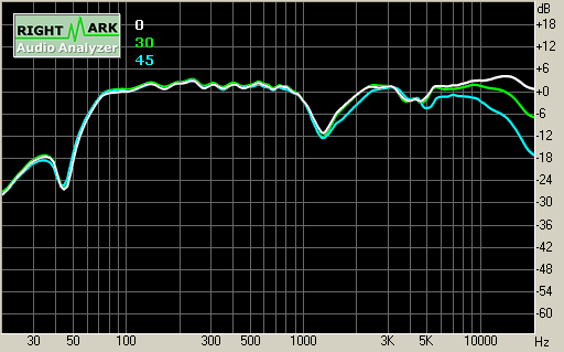 На графиках АЧХ, измеренных под разным углом, можно видеть, что колонки имеют весьма неплохие показатели диаграммы направленности. При отклонении измерительного микрофона от оси ВЧ-динамика на 30 градусов, падение амплитуды на 15 кГц составляет всего 3 дБ. При отклонении на 45 градусов падение составляет уже 12 дБ. Таким образом, для более комфортного прослушивания можно порекомендовать немного повернуть колонки в сторону слушателя.