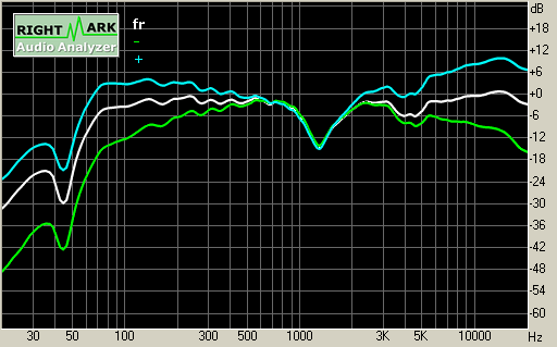 Для более четкого представления о работе регуляторов тембра, мы провели следующие измерения: график АЧХ белого цвета (fr) был измерен при среднем положении регуляторов тембра; график АЧХ зеленого цвета (-) измерялся при выставленном минимальном уровне; синий график (+) соответствует положению обоих регуляторов на максимум.