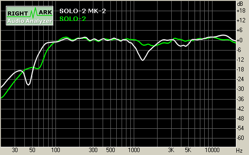 Как можно видеть из сравнительных характеристик, неравномерность у прежней модели SOLO-2 меньше. Виной тому провал в районе 1 кГц. Если вы помните, у колонок SOLO-1 и SOLO-1 MK-2 ситуация была с точностью до наоборот.