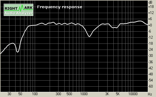 Судя по измеренной на оси ВЧ-динамика спектрограмме АЧХ, неравномерность составляет ±8 дБ в диапазоне частот от 60 до 20 000 Гц. В переходной зоне можно наблюдать неприятный провал на 12 дБ. По всей видимости падение амплитуды на этих частотах обусловлено применением кроссовера.