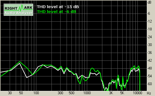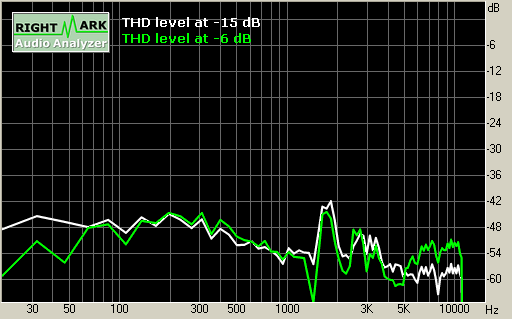 На измеренных спектрограммах гармонических искажений колонки SOLO-2 MK-2 можно видеть довольно низкий уровень искажений. Во всем диапазоне воспроизводимых частот уровень искажений не превышает -42 дБ (1%). Это хорошие результаты. Такое количество искажений с запасом удовлетворяет требованиям устаревшего стандарта DIN 45500 на искажения для Hi-Fi акустики — менее 2% (-34 дБ) в СЧ-диапазоне.