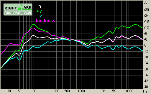 График АЧХ белого цвета (0) был измерен при среднем положении регуляторов тембра. График АЧХ зеленого цвета (+7) измерялся при выставленном максимальном уровне, синий график (-7) соответствует положению регуляторов на минимум, а фиолетовый график (loudness) демонстрирует работу режима усиления низких частот.