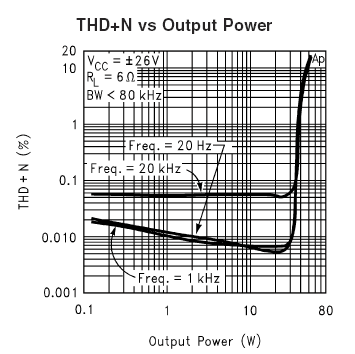 Судя по приведенным диаграммам, используемая микросхема развивает мощность до 30 Вт при уровне искажений, не превышающем 0,1%.