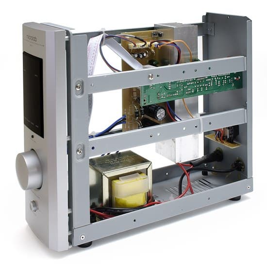 Помимо прочего, на передней панели расположен регулятор общей громкости, а также кнопки выключения питания и выбора режимов коммутации. На задней стороне блока находятся механические зажимы для подключения колонок и два линейных входа (разъем стерео-RCA).