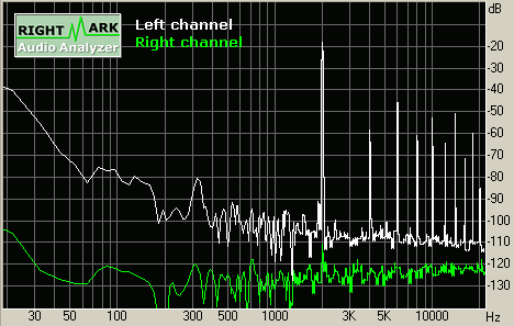 На измеренных спектрограммах искажений можно видеть достаточно низкий уровень искажений, в худшем случае не превышающий -36 дБ.