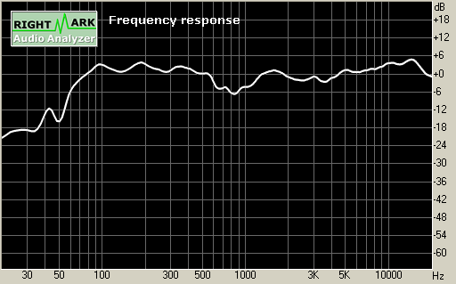Судя по измеренному графику, неравномерность АЧХ составляет ±6 дБ в рабочем диапазоне от 60 до 20 000 Гц. В целом график представляет собой достаточно ровную линию, однако можно видеть падение амплитуды на 6 дБ в районе 800 Гц.