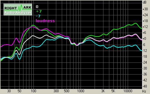 График АЧХ белого цвета (0) был измерен при среднем положении регуляторов тембра. График АЧХ зеленого цвета (+) измерялся при выставленном максимальном уровне, синий график (-) соответствует положению регуляторов на минимум, а фиолетовый график (loudness) демонстрирует работу режима усиления низких частот.